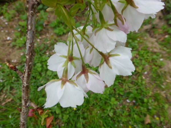 Ce cerisier a une faible croissance et une floraison abondante. Les fleurs blanches viennent  avant les feuilles. Les fleurs sont grouppées en ombelle de 3 à 4 fleurs et situées à l’extrémité de rameaux courts dressés ce qui a donné le nom du cerisier. Tora-no-o signifie Queue de Tigre. Le feuillage devient orange, rouge et jaune en automne.